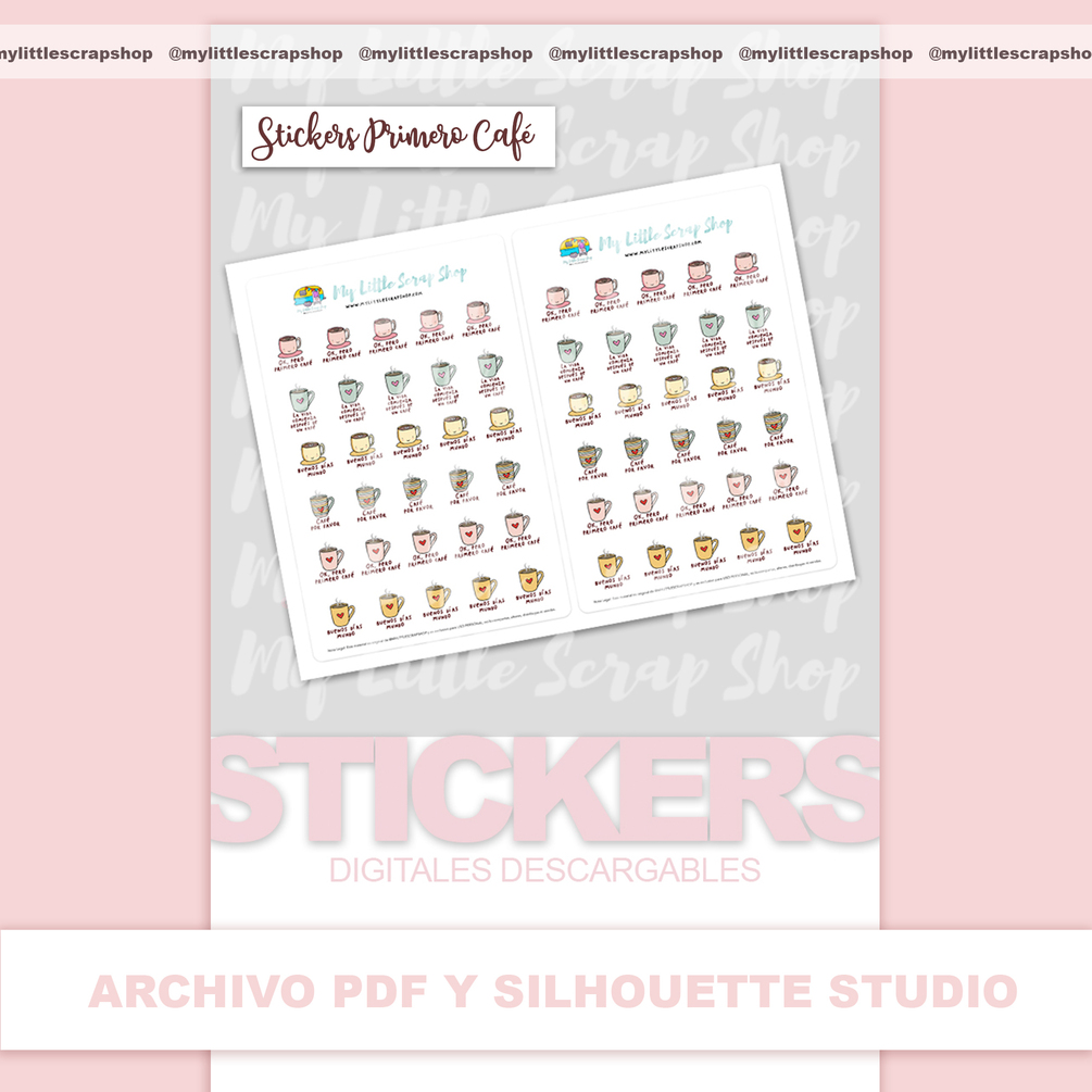 Estos stickers pueden ser impresos y cortados a mano con tijera o también pueden ser cortados con la máquina Silhoutte Studio Cameo, Curio o Portrait utilizando los archivos adjuntos.