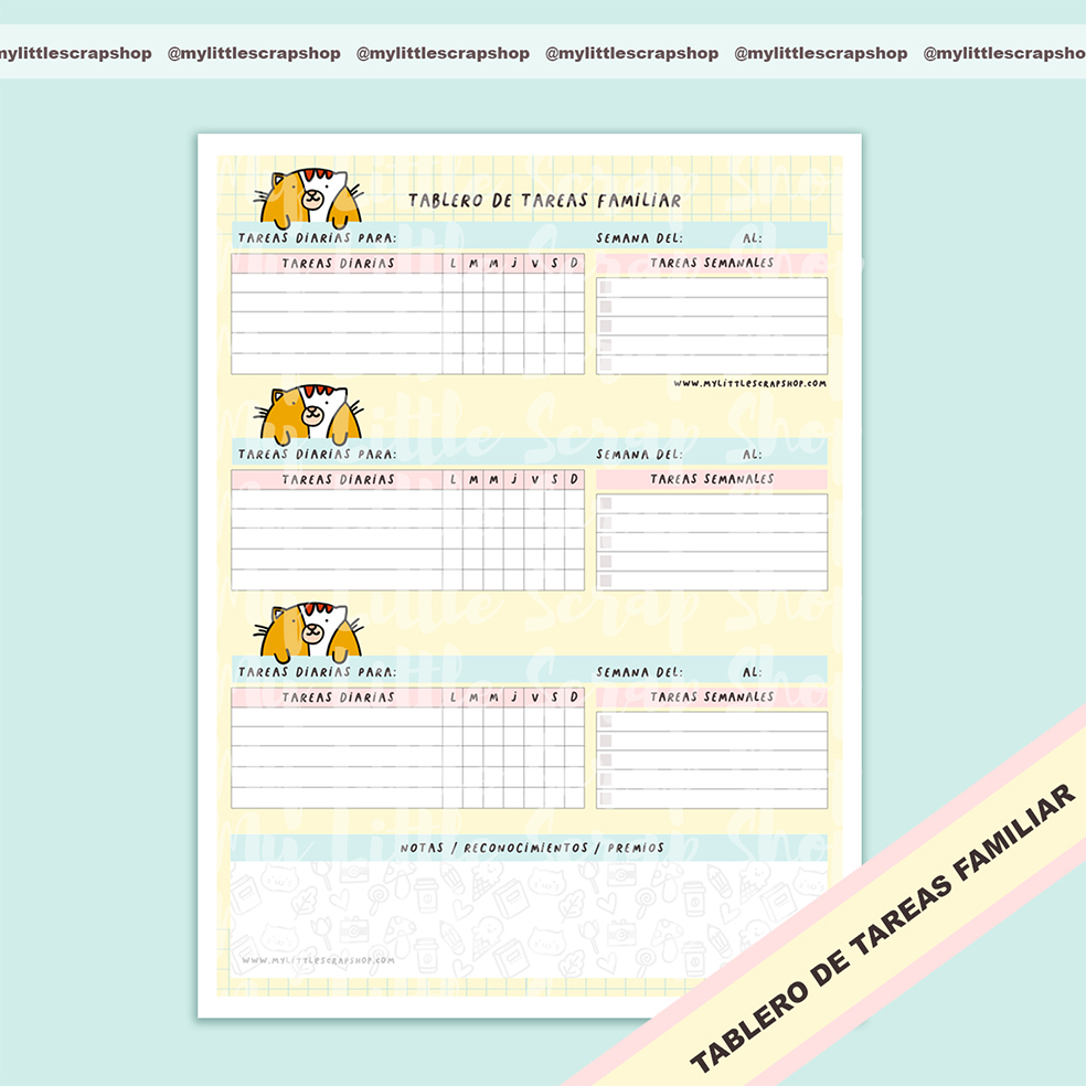 Este tablero de tareas familiar es perfecto para llevar un registro de las tareas diarias y semanales del hogar u otras áreas ya sea en conjunto o de manera individual.